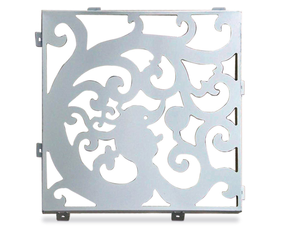 雕花鋁單板采用高強度鋁合金板材,厚度為1.5mm3.0mm,按照一定尺寸、形狀及構造形式加工成型,對其外表進行氟碳樹脂涂裝處理的一種建筑裝飾材料。其常用材料型號為3003,狀態為H24,基本尺寸為1220mm×2440mm (平板)。成型鋁板的尺寸可達1400*5000mm。